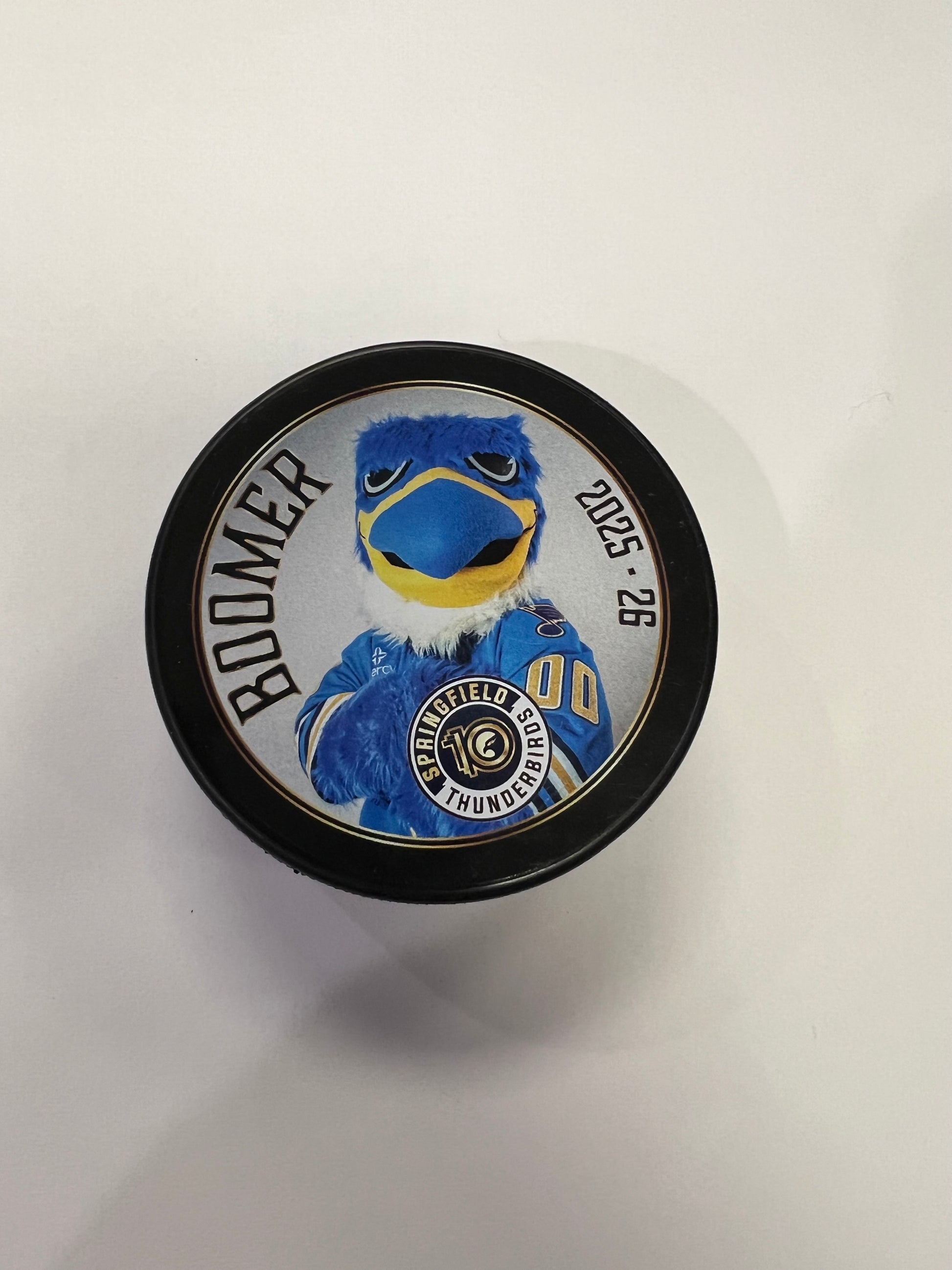 Collect all of the Springfield Thunderbirds souvenir pucks. This officially licensed puck features the Thunderbirds mascot BOOMER on the front and the exclusive arena collection mark on the reverse.